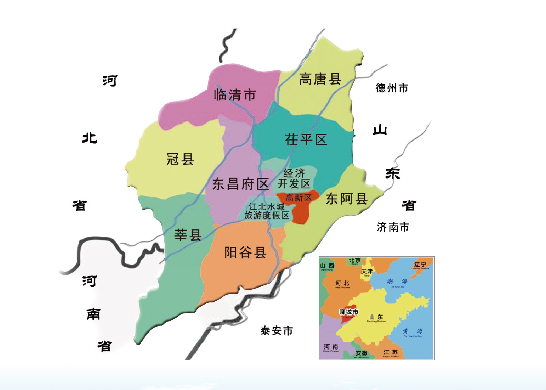 聊城市位于山东省西部,全市总面积8715平方公里,辖东昌府区、茌平区、临清市、冠县、莘县、阳谷县、东阿县、高唐县8个县(市、区)和一个国家级经济技术开发区、一个省级高新技术产业开发区、一个江北水城旅游度假区3个市属开发区。